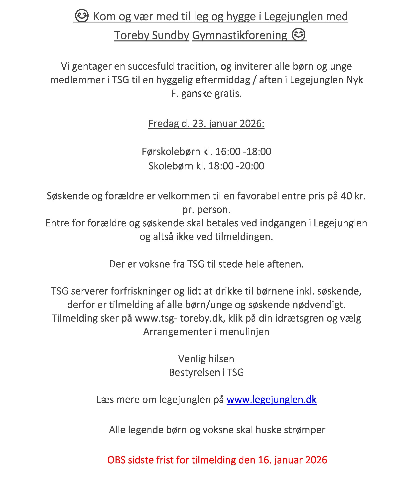 Følg os gerne på facebook - der ligger diverse begivenheder og aktuel info https://www.facebook.com/tsgtoreby
